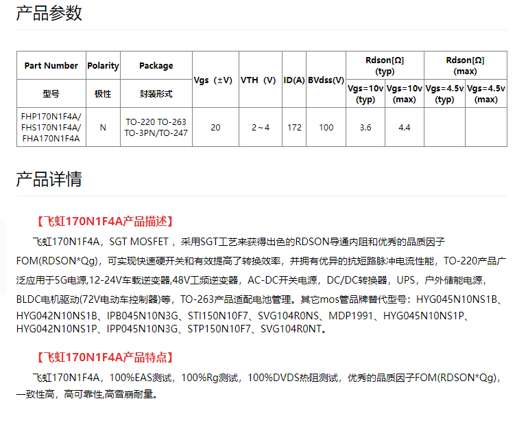 FHS170N1F4A has been chosen by many global manufacturers of lithium polymer batteries to replace IPP045N10N3G in the past, and it has also gained widespread adoption. We recommend you carefully review its detailed product specifications: