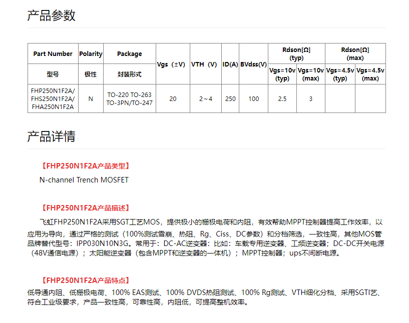 For designers in the sine wave inverter field, selecting the medium and low voltage MOSFET product FHA250N1F2A is equivalent to choosing a comprehensive solution with technical parameters fully compatible with the Infineon IPP030N10N3G, allowing you to carefully consider the detailed parameters: